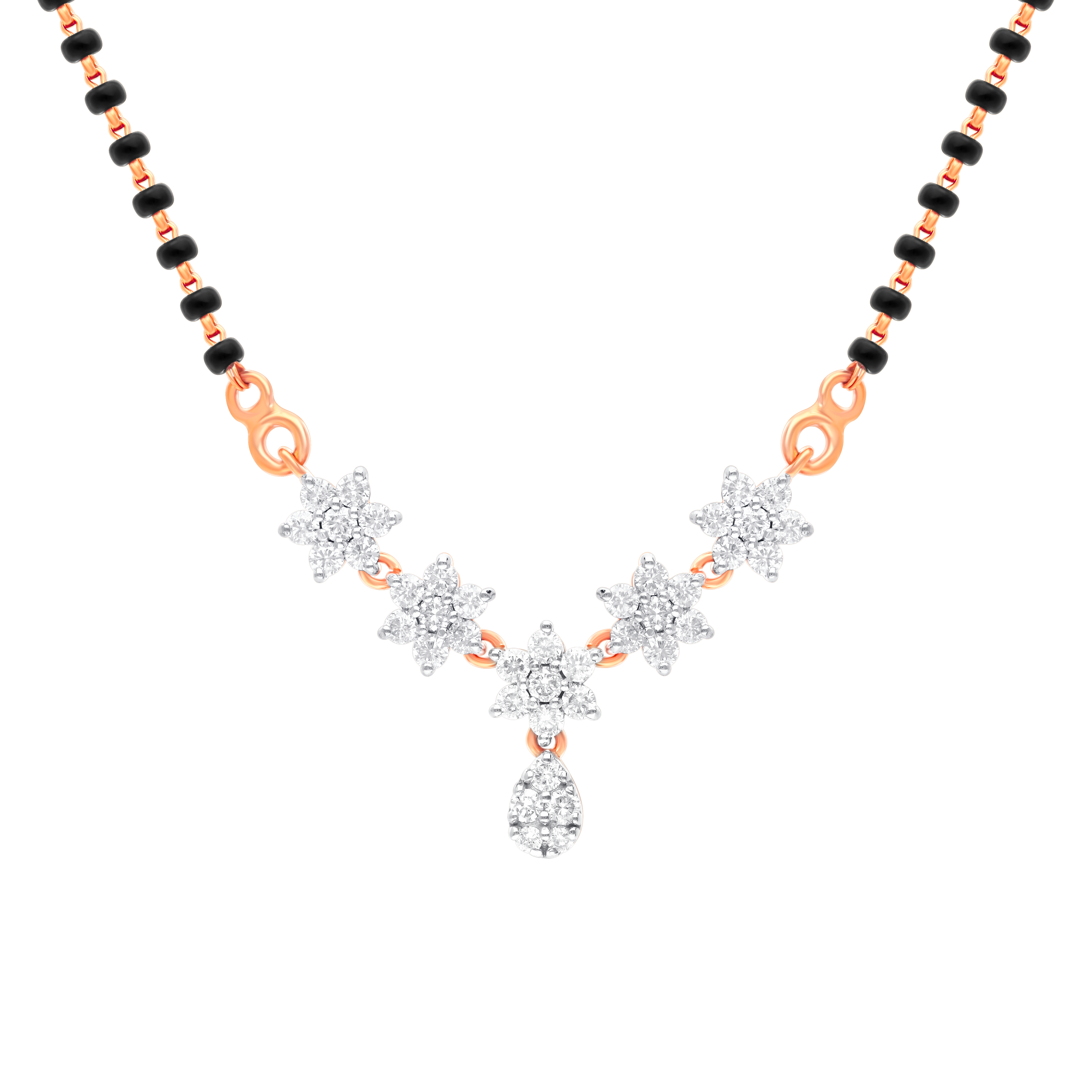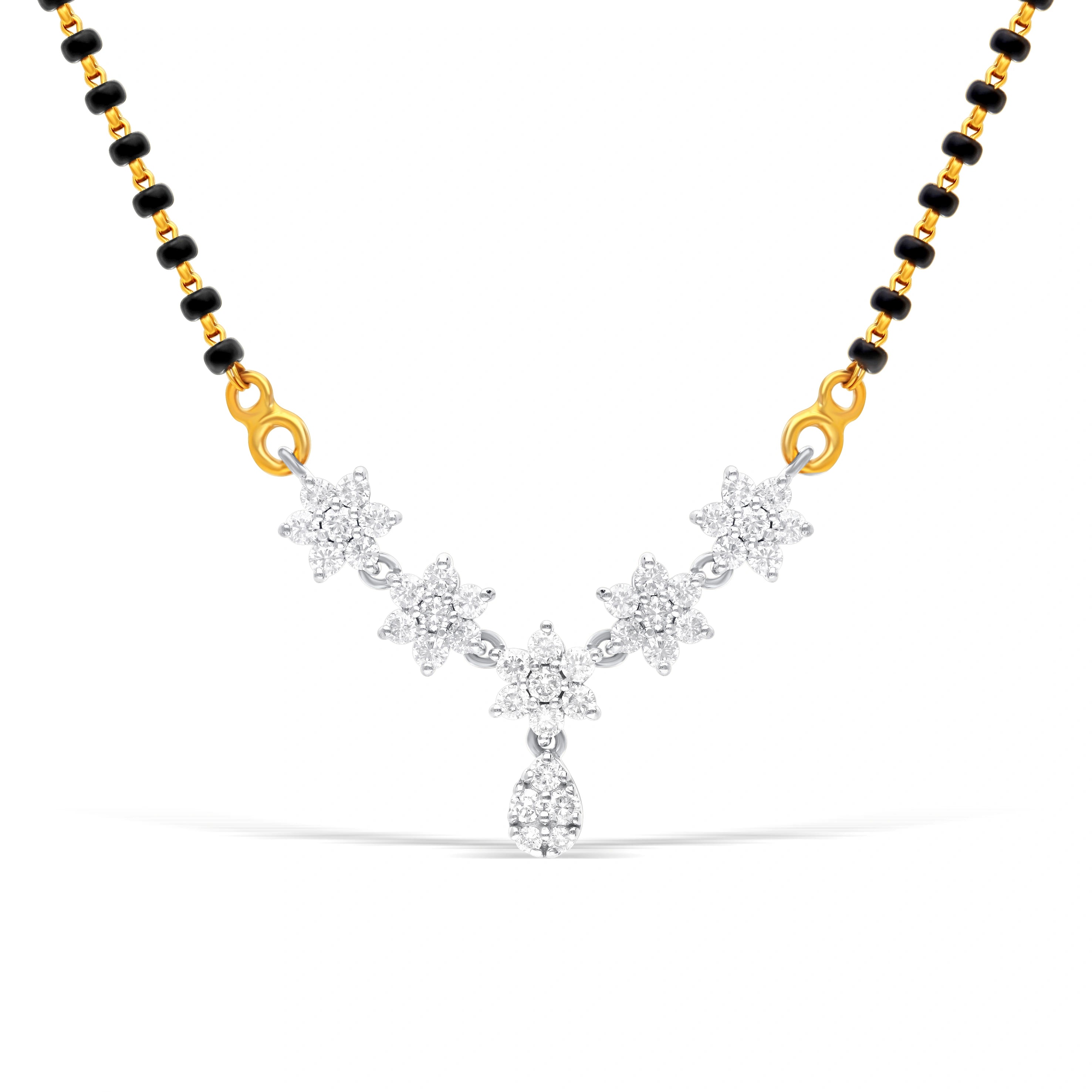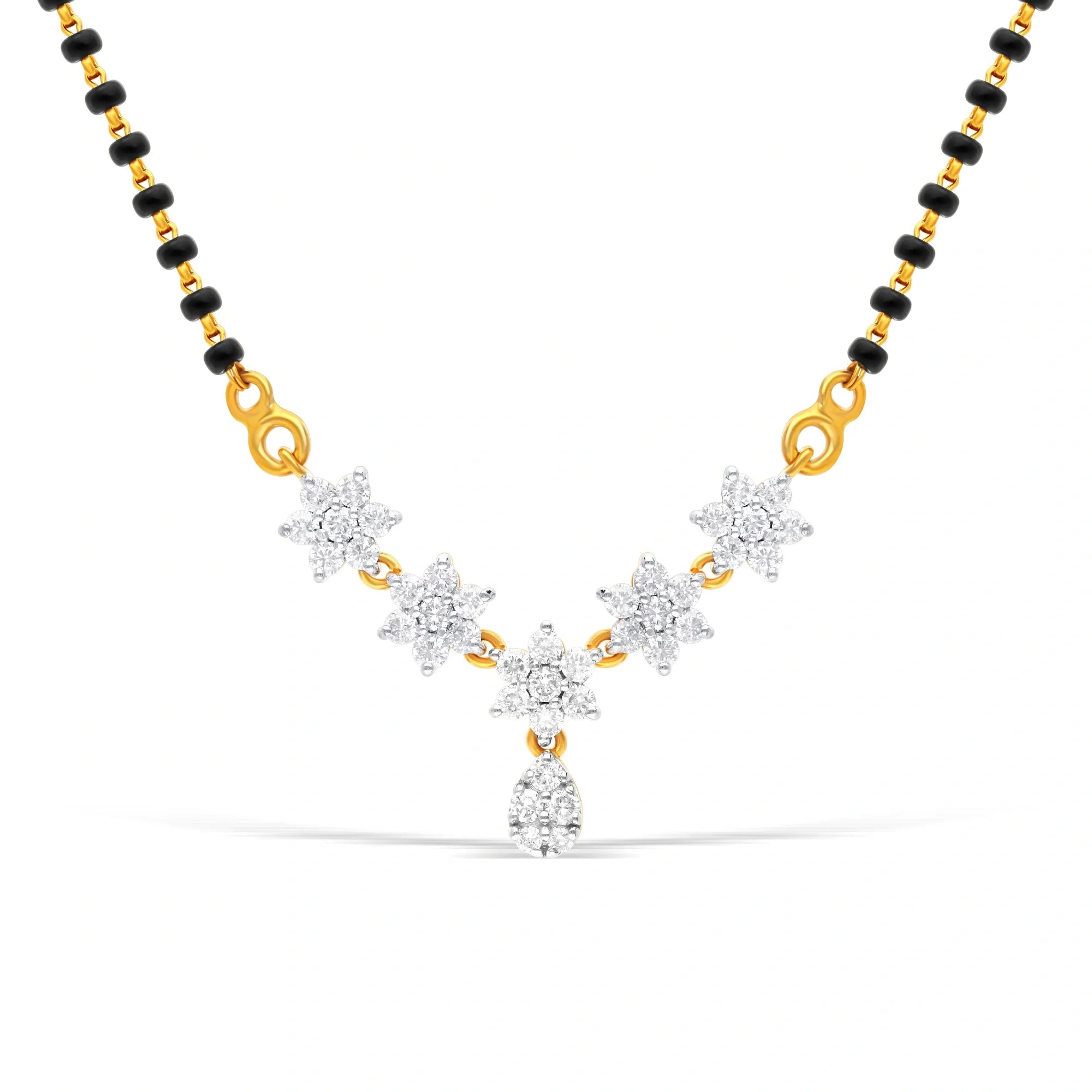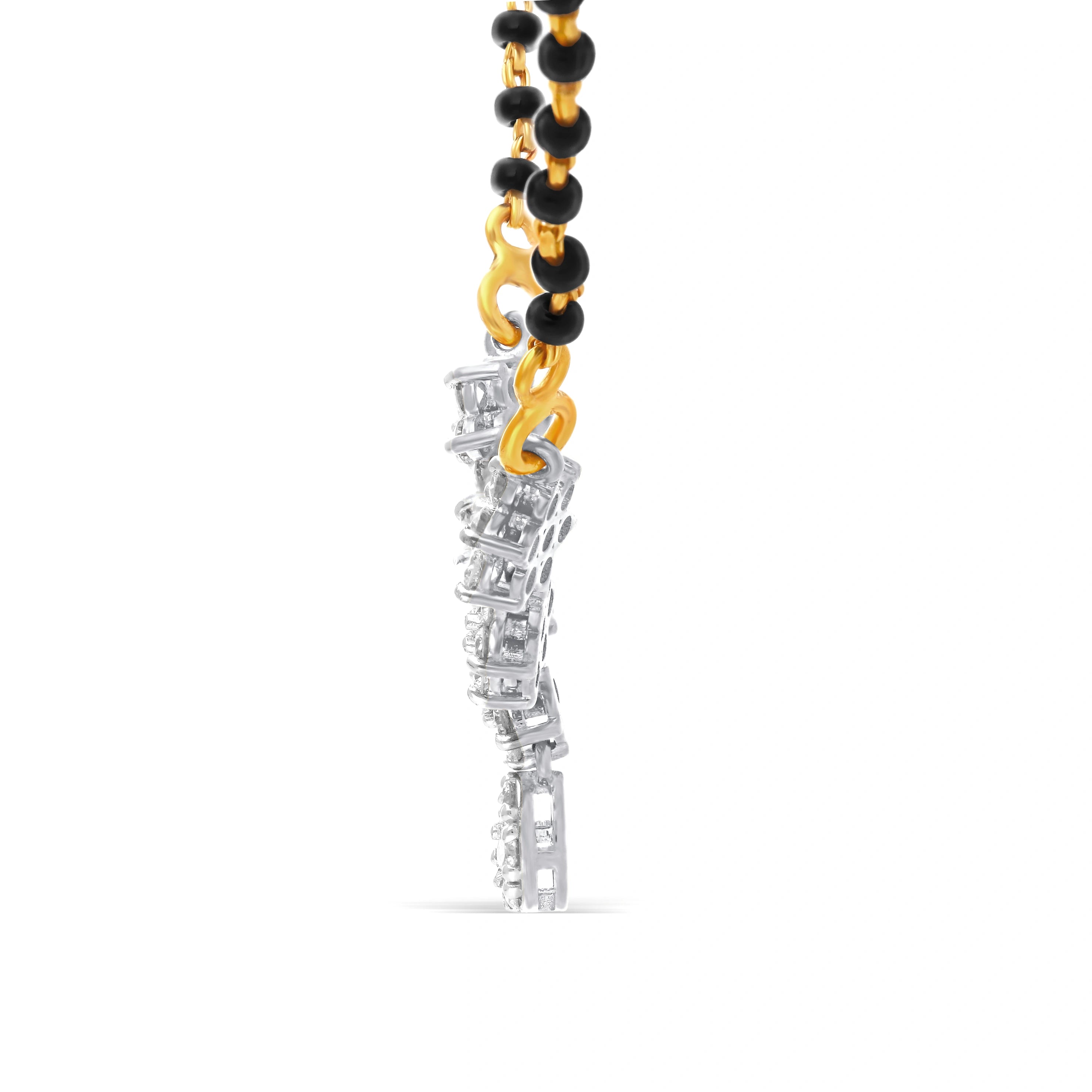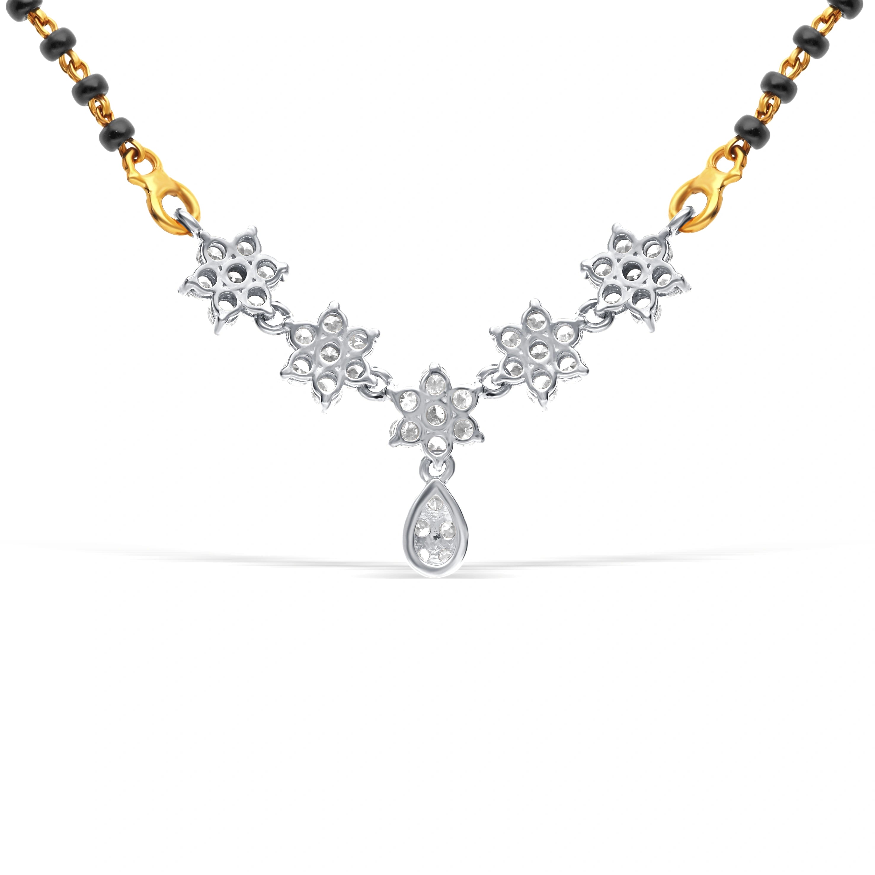 Elevate your style with this elegant mangalsutra, featuring lab-grown diamonds in a floral gold setting. The black beads and pendant provide a secure, comfortable fit, ideal for special events or daily wear. A beautiful, ethical jewelry piece.
